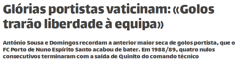 António Sousa salienta que «o próximo golo pode representar um sinal de liberdade para os jogadores»: «Quando há uma sucessão de jogos sem fazer golos passa a haver desconfiança por parte de toda a gente. O FC Porto vive nesse momento de ansiedade. A falta de golos e os resultados notam-se em termos anímicos e psicológicos na equipa.»